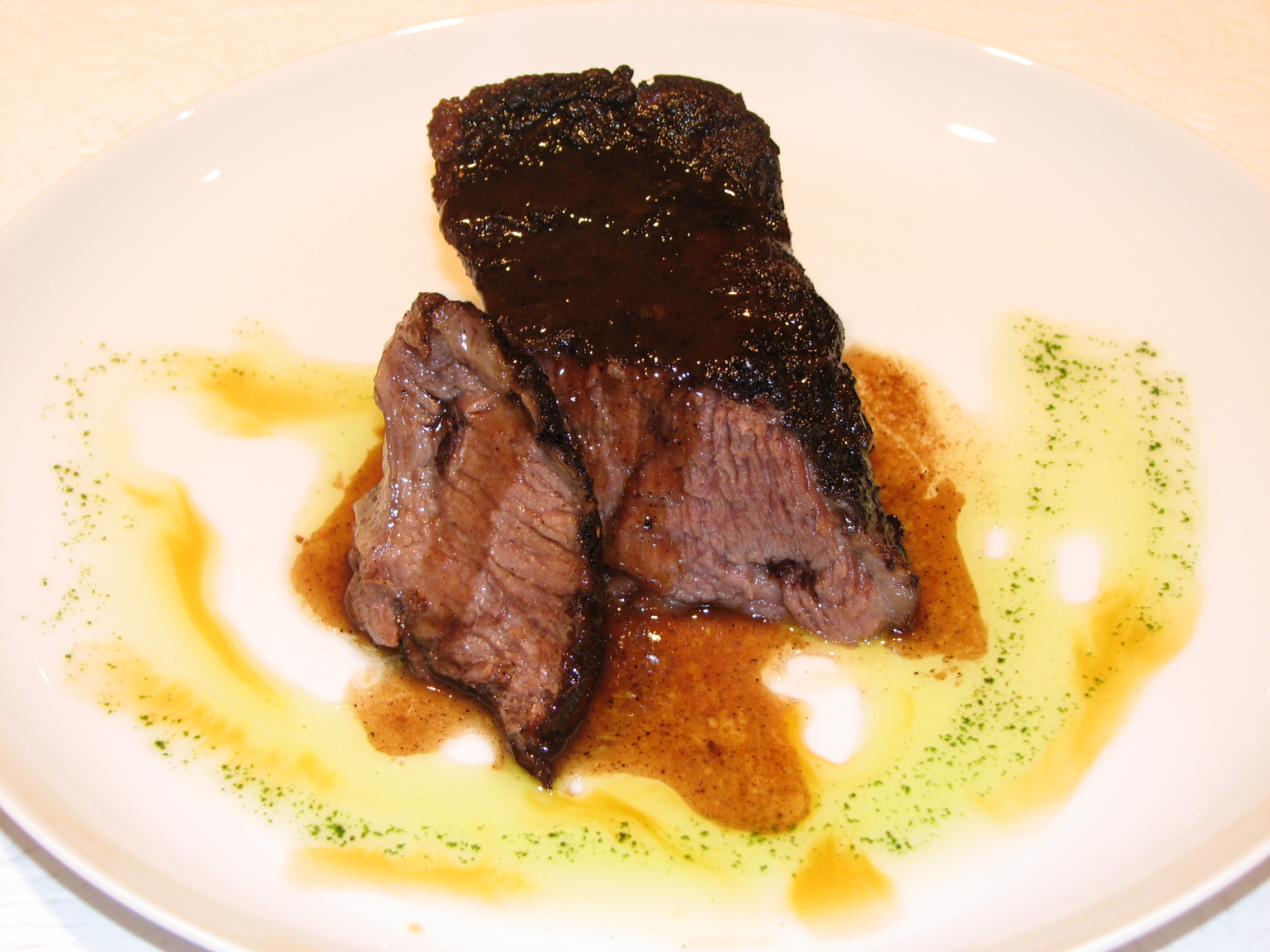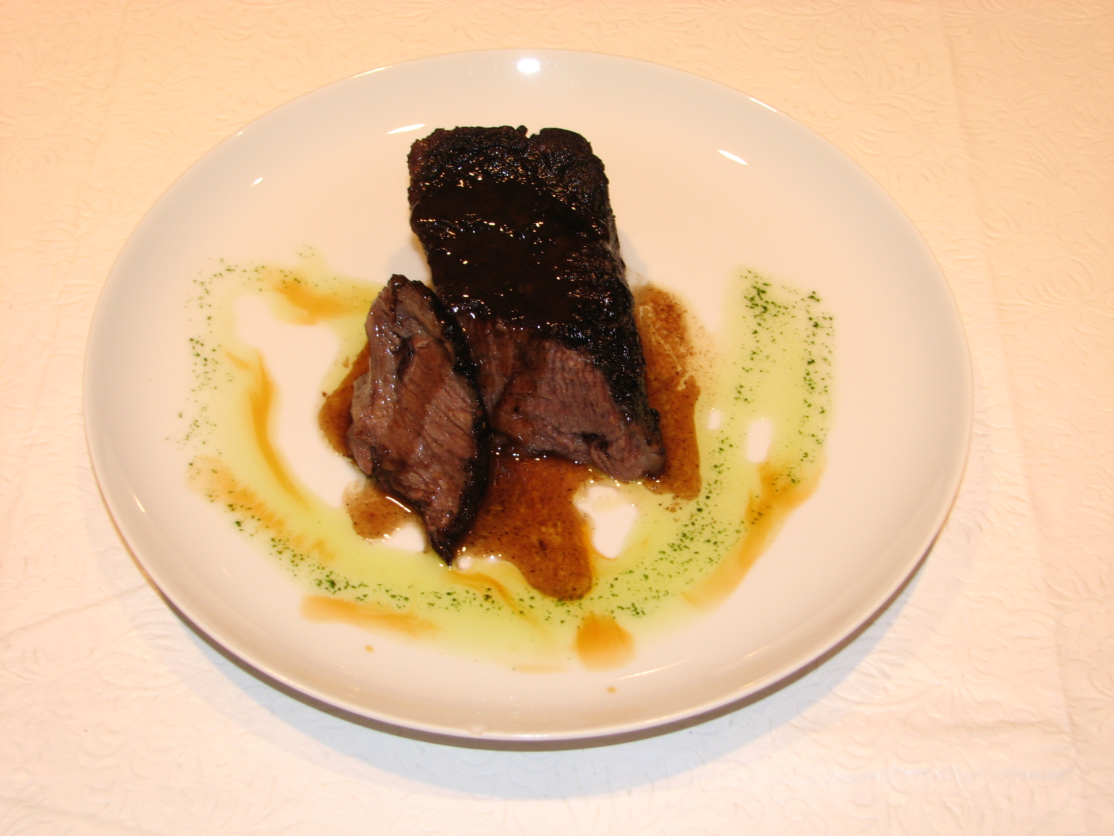 After the ribs were done cooking I removed them from the pot and strained the cooking liquid into a pan. I began reducing the liquid for about 20 minutes until it formed a nice, thick, “sauce-like” consistency. Right before the sauce was done, I de-boned each rib and coated them with sauce. The meat ends up being extremely tender, literally just falling apart as you cut into it. The natural flavor of the beef really shines through, and it’s a nice combination with red wine/stock reduction. I garnished the plate with a little cilantro oil to liven up the flavors and added a nice vibrant green color to the plate.