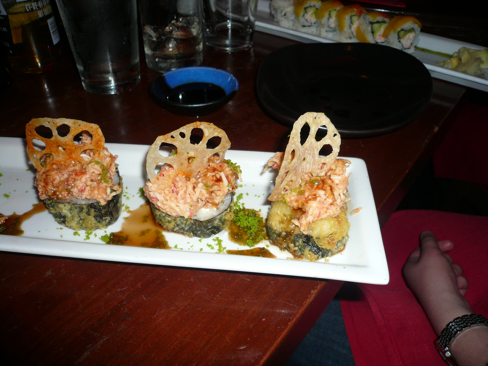 When you walk in the restaurant you notice the abundance of “red.” From the lighting, to the walls, everything is red. The red aside, the décor is very Japanese chic, using woods and traditional Japanese ornaments to jazz up the restaurant. The focal point, the sushi bar, is up against a wall in the middle of the restaurant. The menu is a good size, offering classic sushi rolls, contemporary rolls (like the ones listed above), nigiri sushi, as well as non-sushi appetizers and entrees. I ordered the lobster spring rolls, which didn’t have much lobster in them (if at all), and were kind of boring. Luckily, the sushi didn’t disappoint.