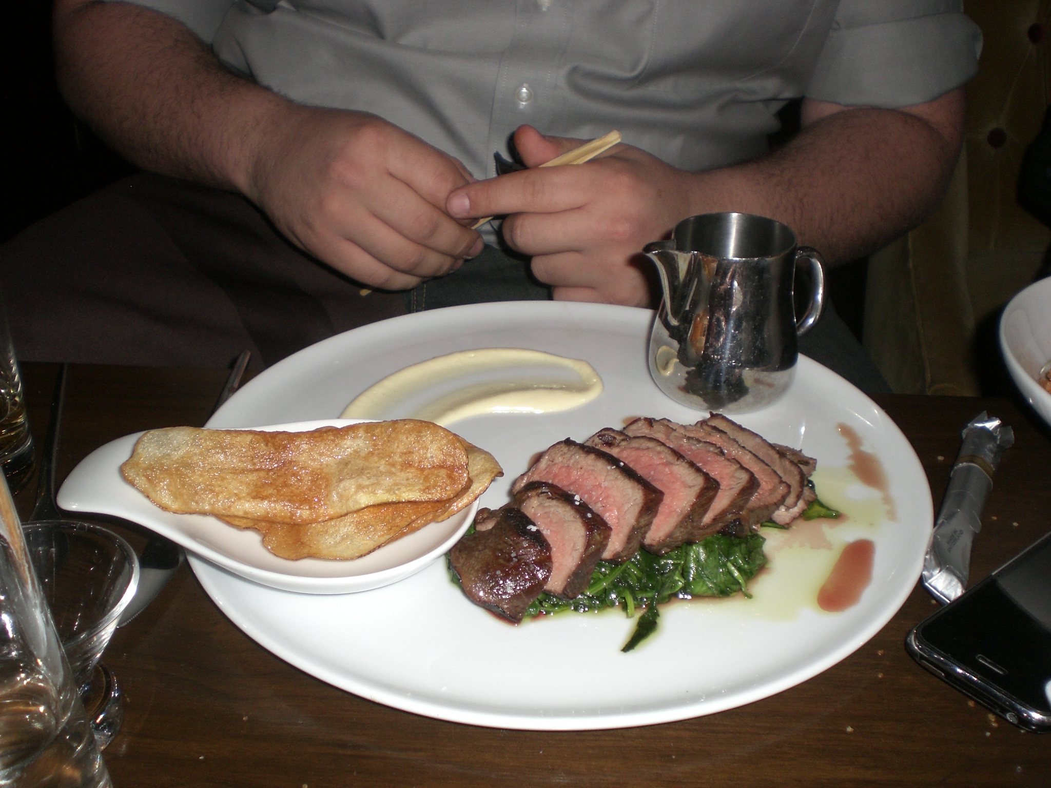 For my entrée I ordered the Japanese Sea Bass ($26), which featured the fish served on top of a bed of sautéed morel mushrooms, edamame, and some other Japanese vegetables that I was unable to identify. The fish was cooked beautifully, having a delicate taste and texture with crispy skin. The vegetables provided a nice contrast to the delicate flavor of the sea bass. There wasn’t much of a sauce; however, the flavors played off each other well enough to not beckon for one. The portion was quite small, luckily we also ordered the Kobe Fried Rice to accompany the dish. The fried rice was good but had a different flavor than what I was used to. The beef was most likely not kobe, and if it was, well then it was not good kobe. My friend ordered the Filet Mignon ($29), which came with a horseradish cream sauce, togarashi fries, and spinach. The meat was cooked beautifully and melted in the mouth. The spinach was expertly prepared and mixed well with the horseradish and soy sauce on the side.