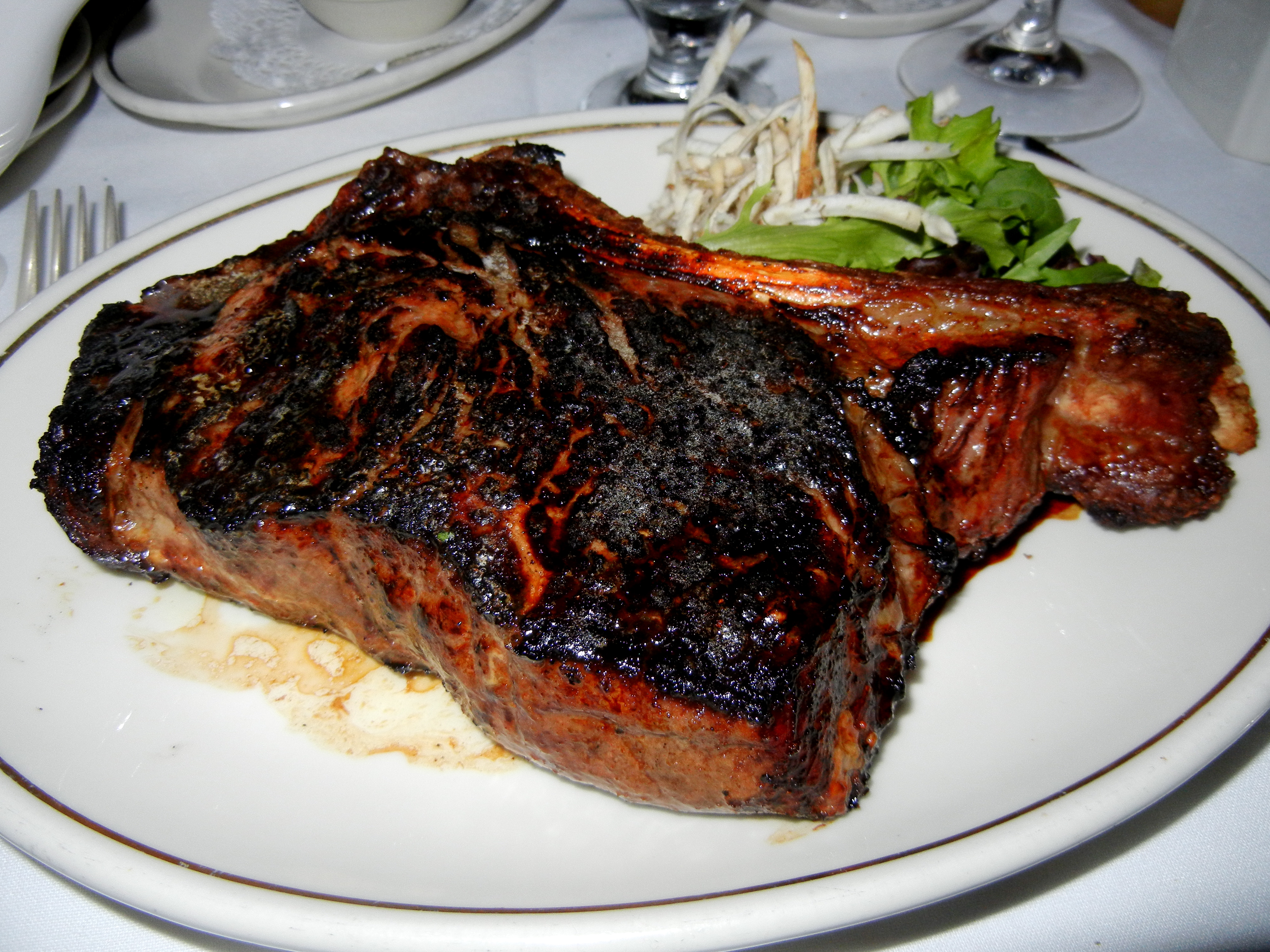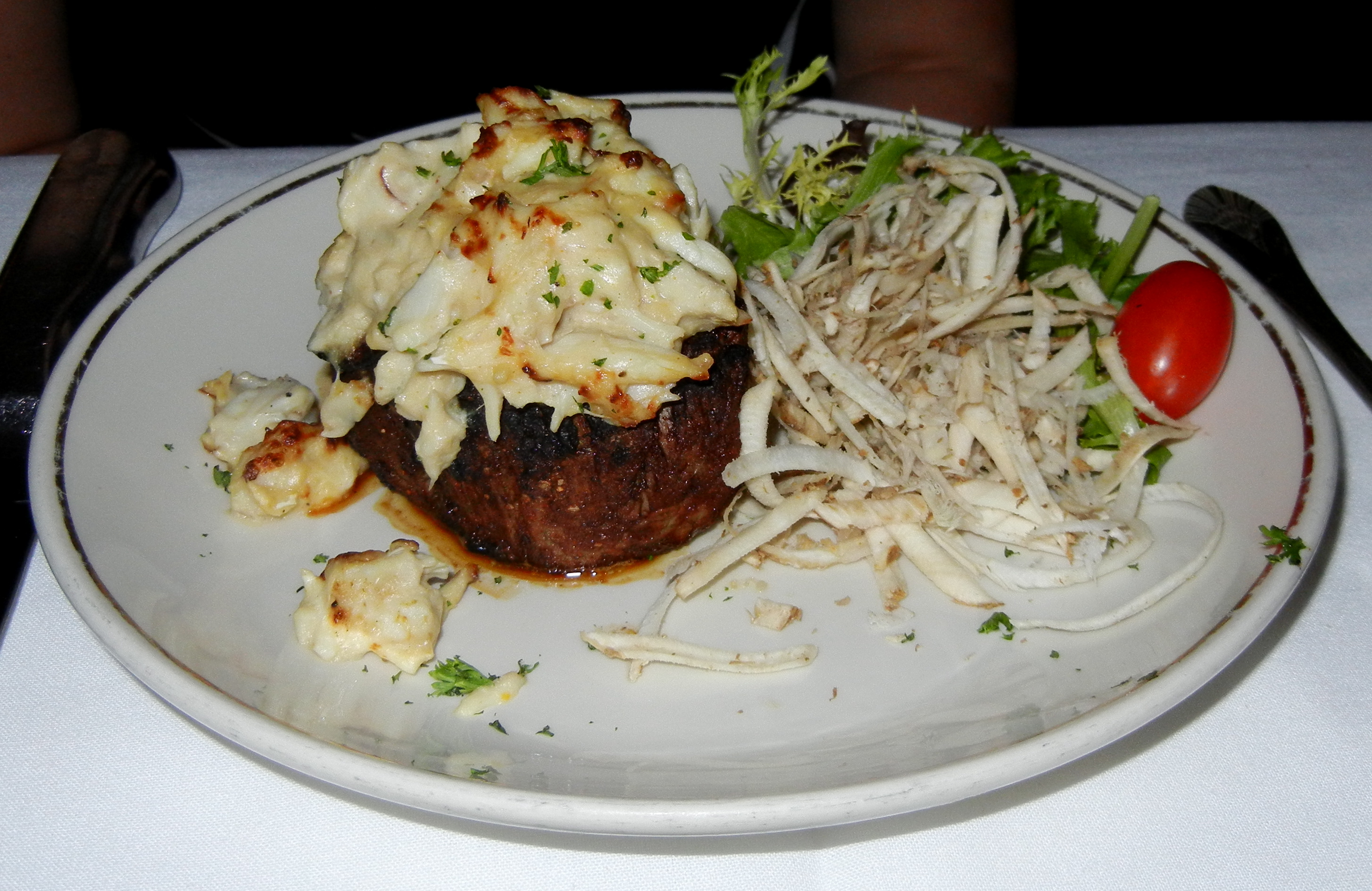 We started with the Prime Rib signature Greenberg Potato Skins, which were literally just fried potato skins accompanied by a horseradish sauce and sour cream with chive. We were lucky enough to try the potato skins on the house, as well as receive two complementary glasses of wine, thanks to a Foursquare special (a mobile app designed to turn restaurant dining into social networking). Simple as they were, the potatoes were very good and quite addicting. As Nathan said, “you can’t eat just one”. A tad more salt would have been nice, but no big deal. For our mains we choose the Bone-In Ribeye and the 6oz. Filet with lump crab on top. The crab on the filet was as fresh as can be and wasn’t diluted with any filler or additives. The filet mignon was incredibly tender, offering a velvety texture, perfectly suited with the warm rich crab on top. The Ribeye was a massive 16oz. portion, which engulfed the entire plate. It was charred to perfection and had that perfect pink center. The quality of the meat was superb; however, I would have like a bit more seasoning on my steak. I ended up dousing my steak with salt and cracked black pepper, something that shouldn’t be necessary at such a steakhouse establishment. For the first time in my life, I preferred a filet mignon over a ribeye, in fact, a precedent for any true steak lover. As our side, we decided to go with the grilled asparagus with hollandaise sauce. The asparagus were nicely grilled but also lacked a bit of seasoning. The hollandaise was absolutely amazing though, I used it as my dipping sauce for the asparagus and my steak – quite pedestrian I know.
