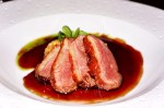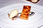 After having some time to breath after the rich soups the main courses came out. First was the pan roasted rockfish and roasted magret of duck. Both were small 3oz. portions, but very satisfying. The rockfish is served with oyster mushrooms and a lemon burre blanc sauce. The delicate fish was very nice with the rich mushrooms and citrus wine reduction. My only complaint about this dish was that the portion of the fish was from closer to the tail of the fish so it was a bit tougher. The duck was sheer perfection however. The fat side was scored and then rendered out in the cooking process to create a very crispy exterior with a nice medium rare center. The duck was well seasoned with salt and coarse black pepper and then served with a red wine demi glace over creamy risotto. The risotto had so much depth of flavor, which was excellent with the tender meaty duck and the full-bodied sauce.