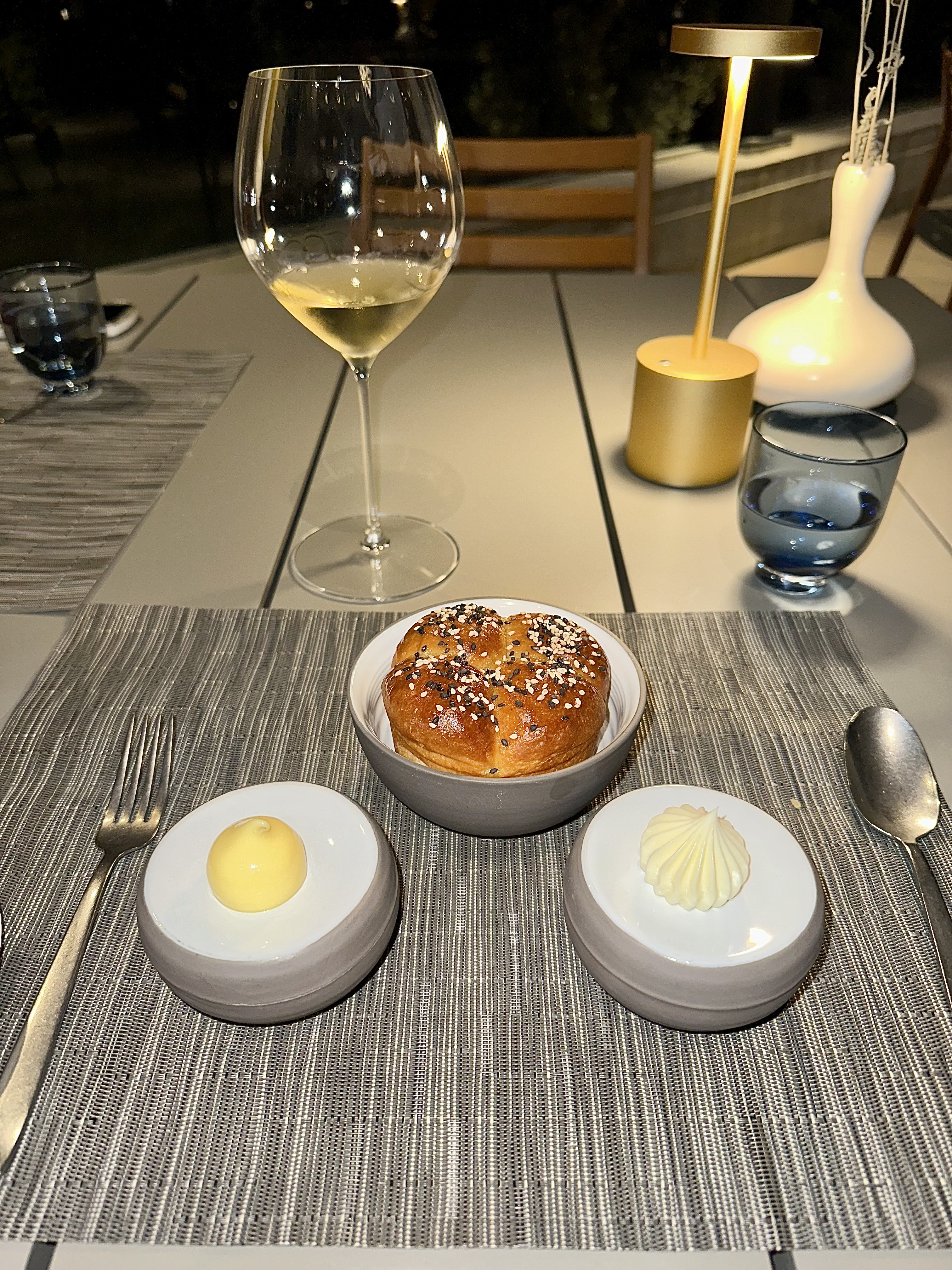 Upon arriving at Auro, guests are greeted with a glass of sparkling wine and a delicate gougère—a charming prelude that sets the tone for the culinary journey ahead. We had requested a table on the terrace to fully immerse ourselves in the breathtaking views of the hotel grounds and the majestic mountains beyond. With the restaurant offering only a seven-course tasting menu, the focus naturally shifts to selecting the perfect beverages. Fortunately, our visit coincided with a special installment of Auro’s wine dinner series, featuring optional pairings curated by Donum Estate for an additional $165—a delightful enhancement to an already memorable evening.