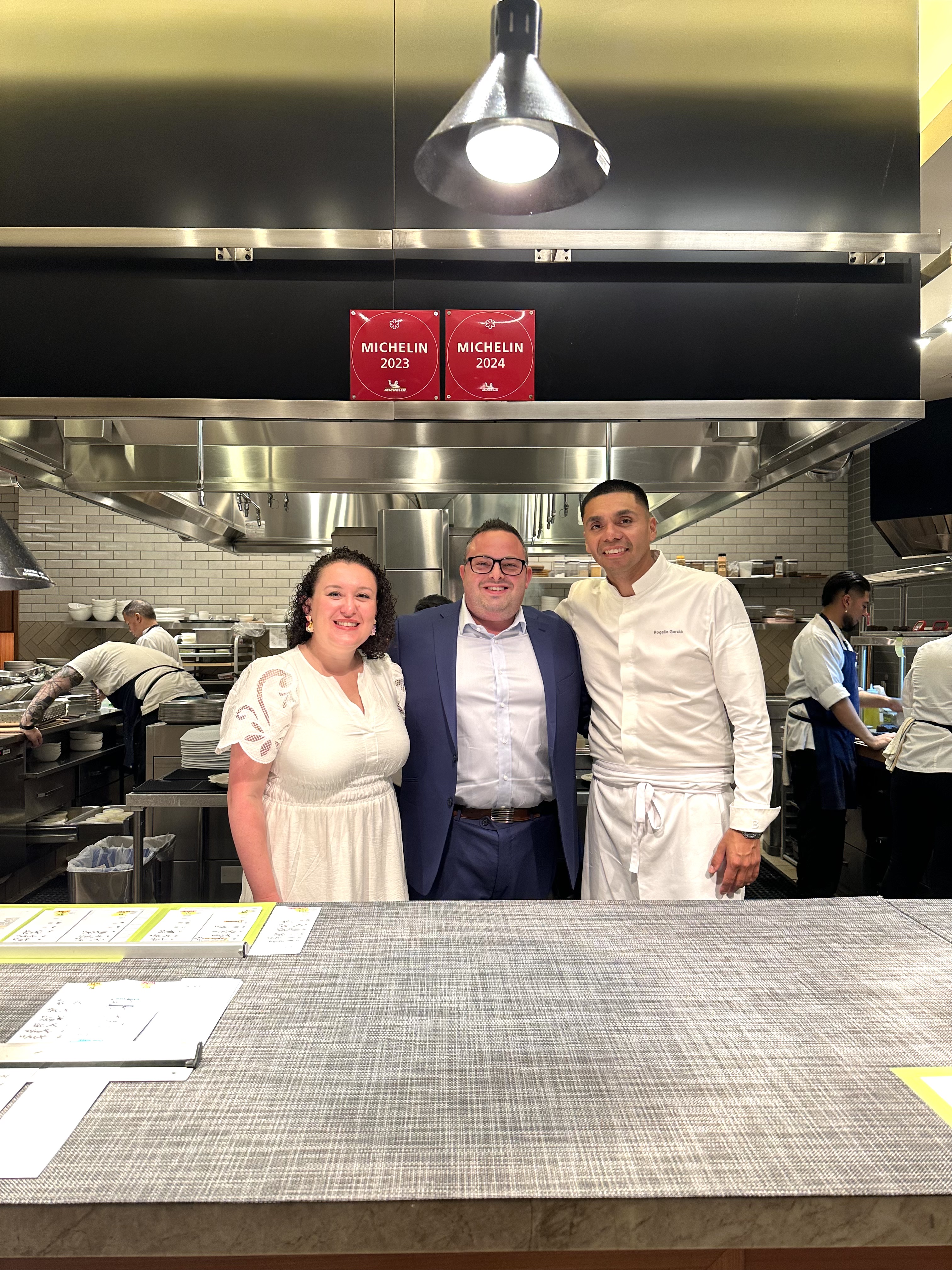 Before dessert, we were invited into the kitchen for a quick tour. As we entered, the staff shouted “Happy Anniversary!”—a heartwarming touch. We chatted with Chef Garcia and his team, then took a photo in front of his Michelin Star plaque.